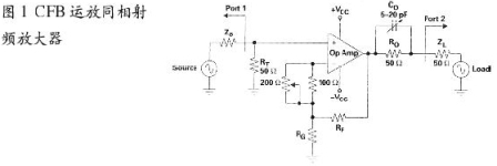 CFB運(yùn)放射頻放大器的基本拓?fù)淙允欠答伔糯笃鹘Y(jié)構(gòu),有同相放大器和反相放大器兩種形式。另一方面,對(duì)射頻電路而言,要特別關(guān)注輸入端與輸出端的阻抗匹配問題,系統(tǒng)常用50Ω電纜連接,由于運(yùn)放的輸入阻抗高,因而輸入端并接一個(gè)50Ω電阻;在輸出端,運(yùn)放輸出阻抗低,故而串接了一個(gè)50Ω電阻。這樣,同相放大器就如圖1所示。