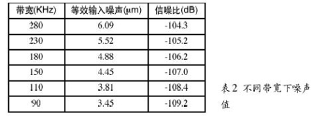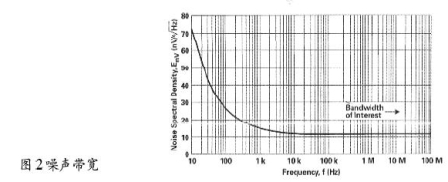 噪聲值—當(dāng)運(yùn)放作為有源器件時(shí),RF噪聲值與運(yùn)放噪聲是一回事。熱噪聲有一定影響,但RF電路使用的電阻通常較小,它們的噪聲可忽略不計(jì)。運(yùn)放RF電路的噪聲與增益和帶寬有關(guān)。例如,使用一個(gè)運(yùn)放,應(yīng)用于10.7MHz中放,信號(hào)電平0dBV,增益為1,噪聲譜密度如圖2所示。此外,帶寬越窄,噪聲越低,見表2。