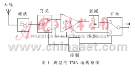 很多情況下,因?yàn)榛九c移動(dòng)設(shè)備不平衡連接的緣故,從基站到移動(dòng)設(shè)備的信號(hào)強(qiáng)度和傳輸距離都要超過移動(dòng)設(shè)備向基站的反向傳輸,并且由于天線與基站間的反饋損耗,使得這種不平衡性變得更大。為了改善這種不平衡性,擴(kuò)大基站接收的覆蓋面,最直接的解決方案是加裝塔裝放大器TMA或Masthead放大器。而TMA中最重要的模塊LNA(如圖1所示)對(duì)接收的信號(hào)具有選頻功能,并把選頻后的信號(hào)進(jìn)行低噪聲放大,使系統(tǒng)靈敏度增強(qiáng),覆蓋半徑增大。
