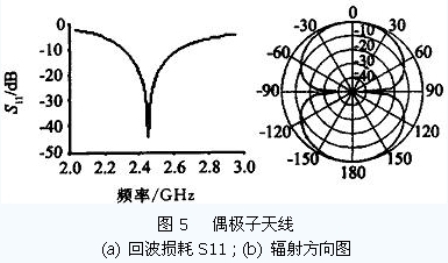 當單個振子臂的長度l =λ/ 4 時(半波振子) ,輸入阻抗的電抗分量為零,天線輸入阻抗可視為一個純電阻. 在忽略天線粗細的橫向影響下,簡單的偶極子天線設(shè)計可以取振子的長度l 為λ/ 4 的整數(shù)倍,如工作頻率為2. 45 GHz 的半波偶極子天線,其長度約為6 cm.當要求偶極子天線有較大的輸入阻抗時,可采用圖4b的折合振子.