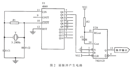 利用數(shù)字電路產(chǎn)生周期脈沖信號的方法有很多,本文采用的是利用方波發(fā)生器4060產(chǎn)生周期為20μs的方波信號,然后觸發(fā)單穩(wěn)態(tài)觸發(fā)器74LS123產(chǎn)生脈寬為50ns~150ns可調的脈沖周期信號。電路原理圖如圖2所示。