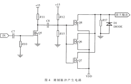弱脈沖放大電路的輸出脈沖通過控制MOS管的通斷控制電容的充放電,從而形成符合要求的調制脈沖,驅動振蕩器工作。調制脈沖產(chǎn)生電路如圖4所示。