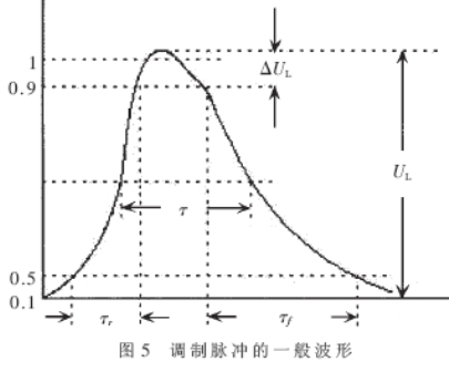 在理想情況下,脈沖調制器輸出的脈沖應為矩形,矩形脈沖頂部平坦,脈沖持續(xù)期間雪崩管振蕩器的功率和頻率穩(wěn)定。但實際上,由于脈沖調制器中不可避免地存在有寄生參量,例如分布電容、引線電感等,而其上的電壓、電流又是不能突變的,這就使得脈沖調制器不可能輸出理想的矩形調制脈沖,一般脈沖波形如圖5所示。