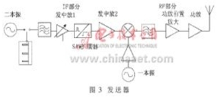 脈沖的擴(kuò)展:165MHz的本振脈沖,經(jīng)過(guò)開(kāi)關(guān)截取0.1μs寬度的脈沖,經(jīng)放大?帶通濾波后,得到一個(gè)鐘形脈沖,送到SAW擴(kuò)展器。SAW擴(kuò)展器的激勵(lì)脈沖可以是一個(gè)寬度小于8ns的窄脈沖,也可以是一個(gè)帶有載波的鐘形脈沖,為了得到較大的功率,在此選用了鐘形脈沖。