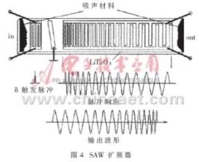 擴(kuò)展器的原理圖如圖4所示。主要由壓電晶片(這里采用了LiTaO3晶體)和光刻在其表面上的叉指換能器組成。觸發(fā)脈沖輸入換能器后,由逆壓電效應(yīng)激勵(lì)出聲表面波。傳播到輸出換能器后,由壓電效應(yīng)轉(zhuǎn)換成與叉指條周期一一對(duì)應(yīng)的電磁波。由于聲表面波到達(dá)換能器時(shí)間上的差異,得到了一組頻率按線性變化的展寬電脈沖。