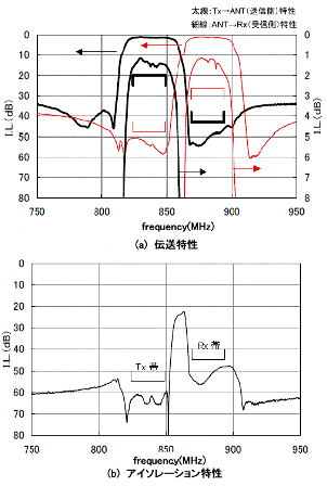 舉例來說,圖1所示的是BAND5(800MHz )收發(fā)雙工器(產(chǎn)品尺寸2.5×2.0×0.6mm)的傳輸特性以及隔離度。一般的隔離度和過濾性的損耗是相互制約的關(guān)系,但本產(chǎn)品對于Tx頻段能實(shí)現(xiàn)60dB的高隔離度,同時(shí)使Rx損耗維持在1.8dB。
