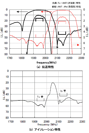 第二個(gè)例子,以圖2的BAND1(2GHz)收發(fā)雙工器(產(chǎn)品尺寸3.0×2.5×1.1mm)的特性為例。將特殊的設(shè)計(jì)技術(shù)引入到表面波難以實(shí)現(xiàn)低損耗的BAND1(2GHz)中來,在得到實(shí)際使用所需的隔離度的同時(shí),還能實(shí)現(xiàn)Tx損耗1.4dB 和Rx損耗1.8dB這樣杰出的低損耗特性。一直以來,介質(zhì)收發(fā)雙工器在BAND1(2GHz)頻帶曾一度占據(jù)了主流的地位,而目前表面波做到了不亞于它的損耗值。由此,表面波收發(fā)雙工器替代了介質(zhì)收發(fā)雙工器成為了當(dāng)今主流。