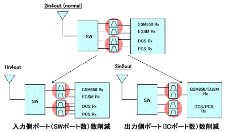 在手機(jī)的高頻率無線通信電路中使用的表面波濾波器,分為CDMA收發(fā)用的級間濾波器和GSM用的TOP濾波器等。村田的濾波器不僅具有低損耗和高抑制度的電特性,還由小型、薄型的各種產(chǎn)品尺寸構(gòu)成了豐富的商品線,可以對應(yīng)各種電路設(shè)計(jì)的需求。例如, 在多頻段發(fā)展的高頻無線通信電路中,為了減小電路基板上的貼裝面積,將兩個(gè)頻帶的單濾波器(產(chǎn)品尺寸1.35×1.05×0.5mm)合二為一,制造出了雙濾波器(產(chǎn)品尺寸1.8×1.35×0.5mm)。此外還運(yùn)用特殊的技術(shù)制造許多獨(dú)特的商品,如將雙層濾波器的輸入端合并為一個(gè)的1in4out產(chǎn)品,以及將平衡器的輸出端合并為一的2in2out產(chǎn)品等。通過共用輸入端可以節(jié)省原本用于分頻的開關(guān)(SW)。同時(shí),共用平衡輸出端可以使連接濾波器的高頻IC的端口數(shù)目減少(圖3)。這是在表面波濾波器的設(shè)計(jì)中通過調(diào)整阻抗和相位等方法,從而使差分端口實(shí)現(xiàn)共用。這些濾波器可以在多頻帶化發(fā)展的高頻無線電路中,為外圍電路的簡化及電路整體的小型化做出貢獻(xiàn)。今后村田制作所將繼續(xù)致力于研發(fā)更小型化和高性能化,同時(shí)又具有輸入端以及輸出端共用功能的單濾波器、雙濾波器產(chǎn)品。