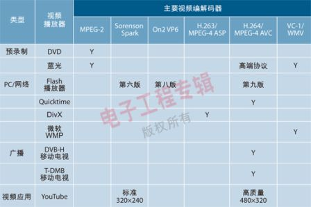 對于想在手機上觀看視頻的用戶來說,移動多媒體處理器需要識別和支持多種視頻編碼標(biāo)準(zhǔn)。表1列出了目前在用的各種視頻編解碼器。內(nèi)容兼容性是支持“任何地方,任何內(nèi)容”這個理想目標(biāo)的關(guān)鍵。為了推進移動視頻的普及,用戶不必知道他們的設(shè)備支持何種格式或分辨率。用戶也許不能在他們的手機上以全高清的分辨率觀看高清編碼的視頻,但他們希望能用手機播放出來,并能輸送到電視機上觀看。