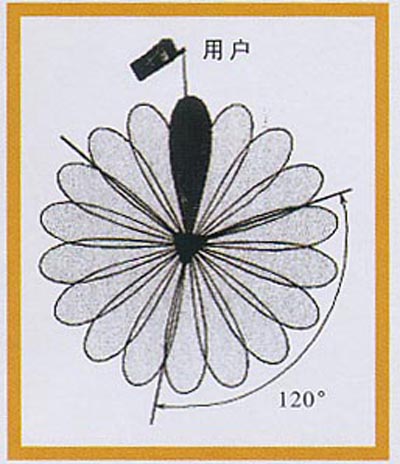 (1)波束轉(zhuǎn)換智能天線波束轉(zhuǎn)換智能天線具有有限數(shù)目的、固定的、預(yù)定義的方向圖,它利用多個并行窄波束(15°~30°水平波束寬度)覆蓋整個用戶區(qū),每個波束的指向是固定的,波束寬度也隨天線元的數(shù)目而確定(見圖2)。波束轉(zhuǎn)換系統(tǒng)實(shí)現(xiàn)比較經(jīng)濟(jì),與自適應(yīng)天線相比結(jié)構(gòu)簡單,無需迭代,響應(yīng)快、魯棒性好。但預(yù)先設(shè)計(jì)好的工作模式有限,窄波束的特性將極大地影響系統(tǒng)性能。