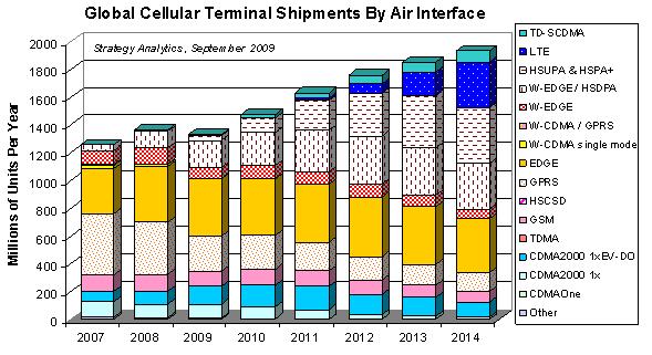 GaAs功放在無線手機(jī)射頻前端應(yīng)用中一直保持較高的使用率,盡管有CMOS功放虎視眈眈,但在3G領(lǐng)域,GaAs以其高線性度、高效率的特性處于絕對(duì)的市場(chǎng)領(lǐng)先地位,而CMOS功放由于性能、功耗等因素影響,只能用于短距離、低功率的領(lǐng)域,比如WLAN、PHS等。隨著3G的演進(jìn),GaAs的市場(chǎng)空間將穩(wěn)步上升,下圖為市場(chǎng)調(diào)研公司提供的全球手機(jī)終端出貨情況。
