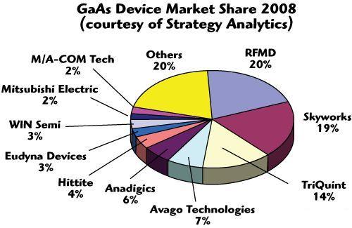 經(jīng)過多年的發(fā)展,GaAs供應(yīng)商已經(jīng)形成了穩(wěn)定的市場(chǎng)格局,由于GaAs產(chǎn)品與工藝關(guān)系非常大,大部分廠商都有自己的工廠。下圖是經(jīng)濟(jì)危機(jī)開始時(shí)2008年GaAs市場(chǎng)占有率情況。