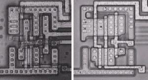 圖2:NAND門驅(qū)動(dòng)一個(gè)反向器的光學(xué)照片(包含金屬層和去掉金屬層)。