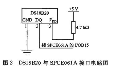 溫度檢測單元采用D1S8B02型傳感器,是美國DALLAS公司推出的一種改進(jìn)型智能溫度傳感器,與傳統(tǒng)的熱敏電阻等測溫元件相比,它能直接讀出被測溫度,并且可根據(jù)實(shí)際要求通過編程實(shí)現(xiàn)9~12位的數(shù)字值讀數(shù)方式。DS18BZo與SPCEo61A單片機(jī)的接口電路如圖2所示,由于DS18B20傳感器支持“一線總線”接口,因此只需將DS18B20信號線接到單片機(jī)的1位1/0線上即可,而且在1根1/0線上可以掛接多個傳感器實(shí)現(xiàn)多點(diǎn)溫度測量。