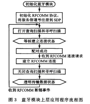 本系統(tǒng)是基于藍(lán)牙的串口應(yīng)用模型SPP(SerialPortProfile)實(shí)現(xiàn)無線數(shù)據(jù)的透明傳輸,在核心協(xié)議棧之上編寫自己的上層應(yīng)用程序。CSR的藍(lán)牙核心協(xié)議棧包括HCI、LZCAP、SDP、RFCOMM等,以固件的形式提供給開發(fā)人員,用戶編寫的應(yīng)用程序和協(xié)議棧一起運(yùn)行在CSR嵌人式環(huán)境中。在CSR程序中,不同任務(wù)之間可以異步地發(fā)送消息,每一個任務(wù)在創(chuàng)建的時候可以讓其中一個擁有消息隊(duì)列,其它的就把發(fā)給任務(wù)的消息提交給該消息隊(duì)列,由任務(wù)調(diào)度程序自動運(yùn)行獲得任務(wù)的消息。藍(lán)牙模塊上層應(yīng)用程序流程如圖3所示。