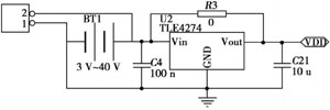 無線傳感器通常的工作電壓范圍為3.0V~3.6V。此次電源設計加入了TLFA274穩(wěn)壓器(如圖2所示),可轉換3V~40V的電壓,比如通常使用的小型電池或者是汽車電池,給使用者帶來了很大的方便。
