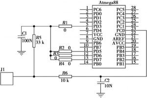 對微控制器芯片選擇Atmel ATmega88,因為它具有低功耗,還有待機模式和主動模式的快速轉換功能,所以無線傳感器能夠在非常短的時間完成數(shù)據(jù)的測量和傳輸;它有一個內(nèi)置的掉電檢測電路,可用來提醒用戶傳感器網(wǎng)絡電池是否需要更換;它還有一個內(nèi)置的A/D轉換器,可以將傳感器的模擬信號轉換成具有10位數(shù)字值的數(shù)字信號(零代表0V,210-1代表電源電壓和最大可能電壓)。