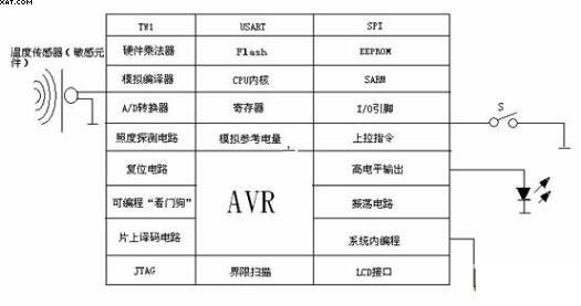占有傳感器實(shí)質(zhì)上是一種智能式的微控制器,主要有敏感元件、微處理器、信號接收與處理電路、開關(guān)及發(fā)光LED等部分組成。其中微處理器或稱作微控制器是采用美國Atmel公司生產(chǎn)的低電壓、高性能的AVR 8-bit RISC微控制器,又稱作Atmega88。此微控制器屬于片上型微處理器,以CIP-51為內(nèi)核,它本身集成了許多外圍設(shè)備,如A/D和D/A轉(zhuǎn)換器、1kB 的SRAM、可編程的8kB的 FLASH存儲器、512字節(jié)的EEPROM、一個內(nèi)部RC振蕩器等。所有的I/O端口的每一個引腳都置上拉電阻,根據(jù)要求可獨(dú)立地通與斷。片上定時器/計(jì)數(shù)器具有定時、捕獲、比較和PWM輸出等功能。Atmega88結(jié)構(gòu)框圖如圖1所示。