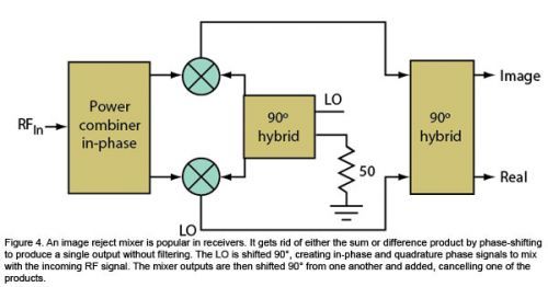 圖4:鏡像抑制混頻器在接收器中最受歡迎。它可以通過(guò)相移去掉和頻或差頻產(chǎn)物,產(chǎn)生單個(gè)輸出,而不需要濾波。LO進(jìn)行90°相移,產(chǎn)生同相和正交相位信號(hào),與輸入的RF信號(hào)進(jìn)行混頻。然后混頻器輸出互相進(jìn)行90°相移,從而去掉部分產(chǎn)物。