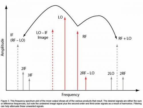 圖3:混頻器輸出的頻譜圖顯示產(chǎn)生的所有不同產(chǎn)物。需要的信號(hào)為和頻或差頻,不過(guò)請(qǐng)注意,有害鏡像信號(hào)和二階和三階信號(hào)為諧波的結(jié)果。濾波有助于減少這些有害信號(hào)。