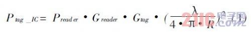 式中,Ptag_IC是芯片接收到的能量,Preader為讀寫器發(fā)射功率,Gtag是標(biāo)簽天線增益,Greader是讀寫器天線增益,R為標(biāo)簽到讀寫器的距離。