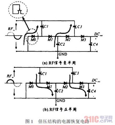 倍壓結(jié)構(gòu)的電源恢復(fù)電路如圖1所示。圖中的二極管在實際應(yīng)用時通常用MOS管替代。輸入正弦交流信號RFin=VAsint。在RFin負半周期時,M0導(dǎo)通,C1充電。C1兩端能夠獲得的最大電壓為VA-Vd,其中,Vd為MOS管M0兩端的電壓降。