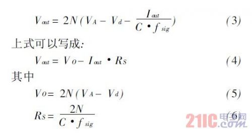 考慮輸出負載的情況。假設(shè)負載抽取電流為Iout,輸入交流信號頻率為fsig,所有電容值都為C,則輸出電壓降低2NIout/Cfsig。于是,考慮輸出負載情況下的輸出電壓為: