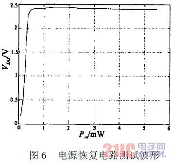 根據(jù)芯片測試結(jié)果,該射頻接口電路能夠在讀寫器4W等效發(fā)射功率下距讀寫器4m處為射頻標(biāo)簽芯片提供足夠的工作電壓,并且在芯片近場時能夠有效地穩(wěn)定電源電壓。解調(diào)信號基本正常可用。因此,該射頻接口電路可滿足超高頻遠距離無源射頻標(biāo)簽芯片的要求,具有實用意義。