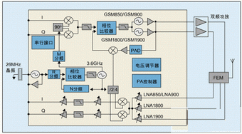 RF集成一個(gè)重要的發(fā)展出現(xiàn)在大約三年以前,當(dāng)時(shí)RF技術(shù)和數(shù)字基帶調(diào)制解調(diào)器的發(fā)展使得在無線手機(jī)中用直接下變頻接收器替代超外差射頻器件成為可能。超外差射頻器件使用多級混頻器、濾波器和多個(gè)電壓控制振蕩器(VCO),已經(jīng)很好地應(yīng)用了多年,但直接變頻射頻器件的集成度能夠大大減少GSM RF總體元件數(shù)。在上世紀(jì)九十年代后期,一個(gè)典型的單頻段超外差RF子系統(tǒng)包括PA、天線開關(guān)、LDO、小信號(hào)RF和VCTCXO,需要大約200個(gè)分立器件;今天,我們能夠設(shè)計(jì)一個(gè)具有四頻段功能的直接變頻系統(tǒng),集成了VCO、VCXO和PLL回路濾波器,而它的元件數(shù)卻少于50個(gè)。