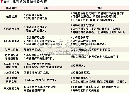 以上這些算法都是對主用戶發(fā)射端信號的直接檢測,基本都是從經典的信號檢測理論中移植過來的。此外,近期一些文獻從主用戶接收端的角度提出了本振泄露功率檢測和基于干擾溫度的檢測。有些文獻對經典算法進行了改進,如文獻[2]提出了一種基于能量檢測-循環(huán)特征檢測結合的兩級感知算法。文獻[3]研究了基于頻偏補償的匹配濾波器檢測、聯(lián)合前向和參數匹配的能量檢測、多分辨率頻譜檢測和基于小波變換頻譜檢測等。表2歸納了文獻中提及較多的一些感知算法,并對其優(yōu)缺點進行了比較。