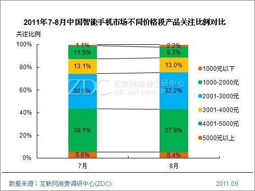 (圖)2011年7-8月中國(guó)智能手機(jī)市場(chǎng)不同價(jià)格段產(chǎn)品關(guān)注比例對(duì)比
