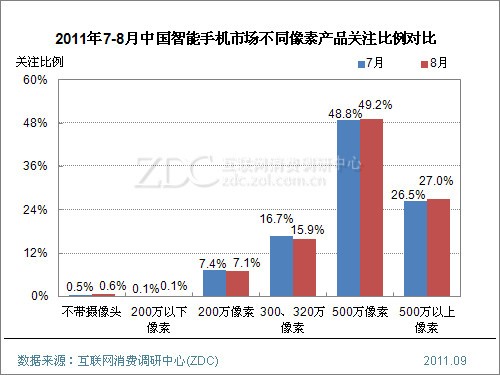 (圖)2011年7-8月中國(guó)智能手機(jī)市場(chǎng)不同像素產(chǎn)品關(guān)注比例對(duì)比