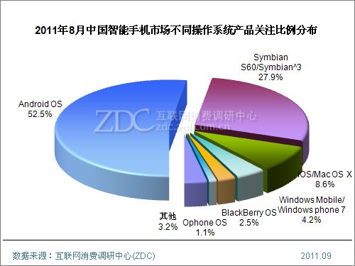 ZDC數(shù)據(jù)顯示,2011年8月中國(guó)智能手機(jī)市場(chǎng)上,搭載Android操作系統(tǒng)的智能手機(jī)用戶關(guān)注度已經(jīng)達(dá)到52.5%,較上月再度攀升2個(gè)百分點(diǎn)。而諾基亞Symbian系統(tǒng)智能手機(jī)的關(guān)注度則持續(xù)下滑,本月跌破三成。其他操作系統(tǒng)產(chǎn)品關(guān)注比例變動(dòng)幅度不大。