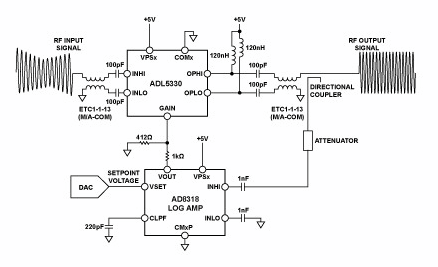 圖1:ADL5330與AD8318配合在自動增益控制環(huán)路中工作