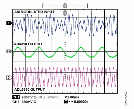 為使AGC環(huán)路保持均衡,AD8318必須跟蹤ADL5330輸出信號的包絡,并向ADL5330的增益控制輸入提供必要的電平。圖3所示為圖1中 AGC環(huán)路的示波器屏幕截圖。將采用50% AM調制的100 MHz正弦波施加于ADL5330。ADL5330的輸出信號為恒定的包絡正弦波,其振幅與AD8318的設定點電壓1.5 V相對應。圖中還顯示了AD8318對不斷變化的輸入包絡的增益控制響應。