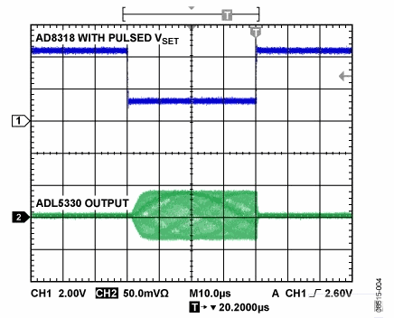 圖4顯示AGC RF輸出對VSET脈沖的響應。當VSET降至1 V時,AGC環(huán)路以RF突發(fā)脈沖予以響應。響應時間和信號積分量由AD8318 CFLT引腳上的電容控制,這與積分放大器周圍的反饋電容類似。電容增加將導致響應速度變慢。