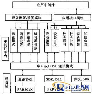 RFID技術(shù)的基本工作原理是:標(biāo)簽進(jìn)入磁場(chǎng)后,接收讀寫(xiě)器發(fā)出的射頻信號(hào),憑借感應(yīng)電流所獲得的能量發(fā)送出存儲(chǔ)在芯片中的產(chǎn)品信息(Passive Tag,無(wú)源標(biāo)簽或被動(dòng)標(biāo)簽),或者主動(dòng)發(fā)送某一頻率的信號(hào)(Active Tag,有源標(biāo)簽或主動(dòng)標(biāo)簽):讀寫(xiě)器讀取信息并解碼后,送至中央信息系統(tǒng)進(jìn)行有關(guān)數(shù)據(jù)處理。中間件是介于應(yīng)用系統(tǒng)和系統(tǒng)軟件之間的一類軟件,它使用系統(tǒng)軟件所提供的基礎(chǔ)服務(wù),銜接網(wǎng)絡(luò)上應(yīng)用系統(tǒng)的各個(gè)部分或不同的應(yīng)用,以達(dá)到資源共享、功能共享的目的.在具體實(shí)現(xiàn)上,中間件是一個(gè)用API定義的軟件層,具有強(qiáng)大的通信能力和良好的可擴(kuò)展性。