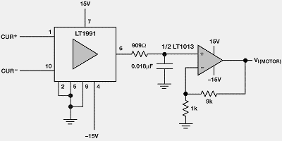 盡管共模信號(H橋的電源電壓)很大,由于這些放大器具有高共模抑制特性,因此仍可精確測量電壓和電流。LT1632逆變器將電壓信號衰減至LT1995的輸入共模范圍內(nèi)。共同使用LT1632s和LT1995產(chǎn)生的輸出電壓ΔV是負(fù)載電壓的0.1倍。