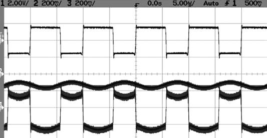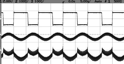 該圖對應(yīng)的是大電阻電機的情況,占空比仍為60%,感應(yīng)電阻為0.1Ω。同樣,軌線1為電壓,軌線2為電流,軌線3為瞬態(tài)功率。值得注意的是,當(dāng)負(fù)載增大,平均電機電流也相應(yīng)增大(從絕對意義而言)。用高阻抗電壓計測得的RMS功耗為20mV (2瓦)。