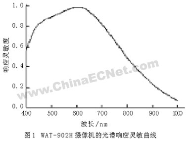 獲得的圖像質(zhì)量直接影響圖像處理程序的復雜度和檢測結(jié)果。如果采用的光源單色性越好,越接近平行光,則圖片的干涉條紋更清晰,質(zhì)量更好。然而單色激光器或者平行光源體積大,而紅外測試系統(tǒng)的一大特點就是結(jié)構(gòu)簡單、緊湊,而提供窄波段的照明價格比較昂貴,且不易控制,因此選用普通的白熾燈作為光源。為了得到較好的紅外圖片,在鏡頭的上方放置一塊雙面鏡面拋光的硅片,從而過濾掉可見光對圖片的影響。同時,選用超低照度黑白攝像機WAT-902H,它的光譜響應靈敏曲線如圖1所示。而紅外線波長為750 nm~1000μm,這樣我們采用普通的光源就可以獲得窄波段的紅外圖像。另外,由于該相機對紅外波段的響應靈敏度不高,可以通過增加光強來克服,從而獲得清晰的紅外干涉圖像,為后續(xù)的圖像分析和處理做準備。