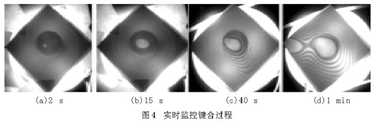 將紅外檢測應用到鍵合裝置中,可以實時監(jiān)控鍵合過程。圖4(a)~(d)是截取的預鍵合過程中的4幅圖片,可以清晰地觀察鍵合波從中間向四周擴張的傳播過程。圖中所標的數(shù)字表示預鍵合時間(晶片經(jīng)活化處理后,從兩晶片開始接觸到逐步鍵合所經(jīng)歷的時間)。1 min后,鍵合面積基本不再發(fā)生變化,預鍵合結(jié)果如圖4(d)所示。
