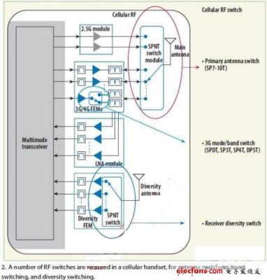 圖2:蜂窩手機(jī)中要求使用大量射頻開關(guān),分別用于天線切換、頻段切換和分集切換。