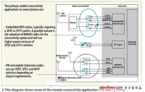 移動(dòng)無線連接選件一般有兩種實(shí)現(xiàn)方式:使用分立元件和芯片組進(jìn)行設(shè)計(jì),或通過第三方模塊制造商提供。不管實(shí)現(xiàn)細(xì)節(jié)如何,在智能手機(jī)的移動(dòng)連接側(cè)存在射頻開關(guān)的多種應(yīng)用。