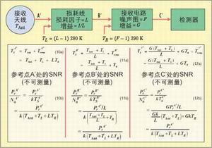 圖3顯示在接收系統(tǒng)中的A、B、C處對Tlocal和Pr/N0進行三次測量,參數(shù)中的上標A、B、C表示測量分別是在這些不同位置點進行的。對于每一個點,存在以下關系: