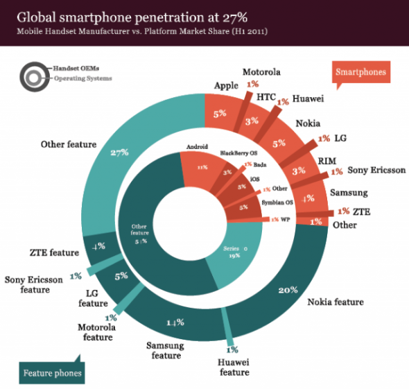 就智能手機市場領導者而言,當前的競爭是在iPhone和Android之間展開的,原因是前手機行業(yè)領導者諾基亞對iPhone的出現(xiàn)反應遲緩,因此在高端智能手機市場上所占份額正在穩(wěn)步下滑。諾基亞已決定從Symbian系統(tǒng)轉(zhuǎn)向Windows Phone系統(tǒng),這一決定不僅令三星、HTC、摩托羅拉、LG和索尼等Android廠商獲得優(yōu)勢,同時也令華為、中興、宏碁、戴爾和華碩等后來者受益。