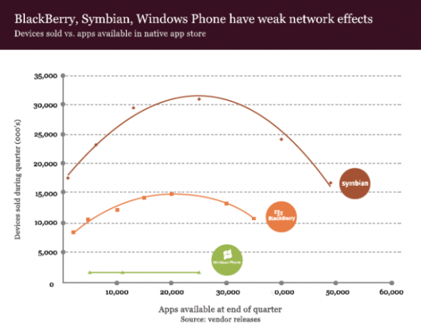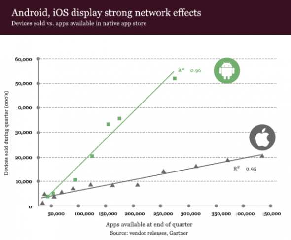 一件有趣的事情是,從手機應用這方面來看,所有排名靠前的智能手機廠商的網(wǎng)絡效應都能表明其產(chǎn)品的受歡迎度。以上圖表顯示的是某一特定時間點在某一特定平臺上的應用數(shù)量,以及這一時間點以前的一個季度中該平臺的手機出貨量數(shù)據(jù)。由此得出的圖表證明Android和iOS備受歡迎,同時也表明對于另一個競爭對手來說,想要成為第三大平臺有多么困難。