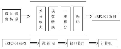 鼠標在人的操縱下移動,微加速度傳感器便會實時地輸出鼠標運動的加速度大小和方向,ADXL203傳感器的量程為±1.7gn ,電壓靈敏度為1000mV/gn,這個電壓信號經(jīng)過差分放大5.0/1.7倍后,通過微控制器A/D轉(zhuǎn)換功能變成與加速度大小對應的數(shù)字信號,加速度經(jīng)過兩次積分,便變成了鼠標移動的位移信號,然后,再經(jīng)過編碼,并通過nRF2401射頻收發(fā)器將位移信號發(fā)射出去。