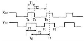 為了實現(xiàn)高精度測量,考慮到T2易受溫度漂移的影響,必須周期性地更新T2的平均值。一種新的改進型脈寬調(diào)制(PWM)解碼方法是通過占空比調(diào)制在X軸和Y軸使用相同的三角形參考波 ,使得每個周期中 T1的中點達到同步 ,這種方法能加快數(shù)據(jù)傳輸時間,也稱之為高速解碼,X軸和Y軸的占空比輸出如圖2所示。