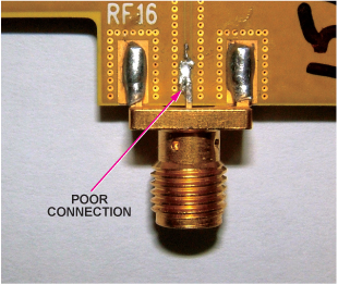 其次需要考慮PCB的裝配連接器與PCB傳輸線路之間的結(jié)點(diǎn)至關(guān)重要,因此連接器的焊接會對過渡產(chǎn)生重大影響。連接不良或未對齊的連接器會破壞電感和電容之間的微妙平衡,從而影響結(jié)點(diǎn)的阻抗。圖5是一個焊接不良的連接器結(jié)點(diǎn)示例。