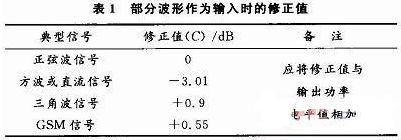 上述情況僅適用于900 MHz~8 GHz的正弦波輸入信號(hào),而通信系統(tǒng)中,還有其他的波形,如果測量其他的波形的功率,則可根據(jù)不同波形的修正C值來進(jìn)行修正,因波形不同修正值也不相同,表1為不同的信號(hào)波形的修正值。